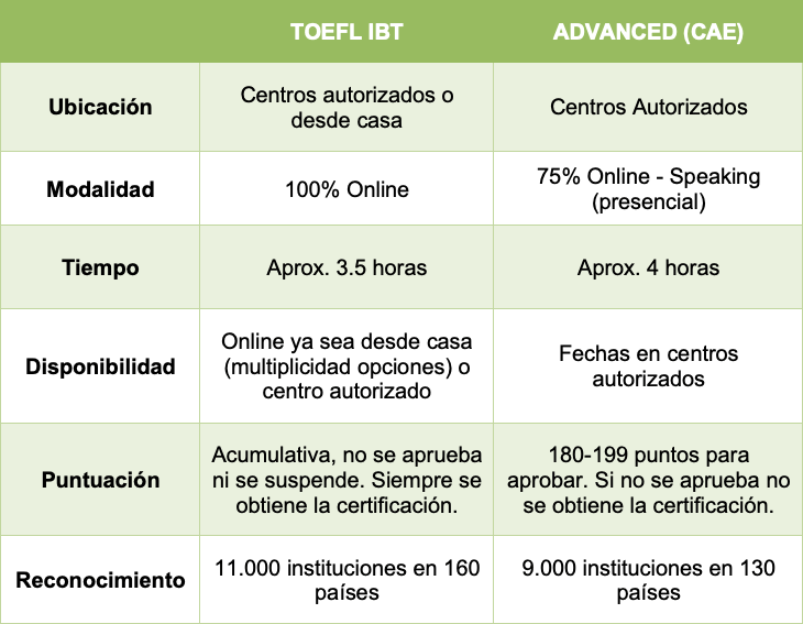 Si deseas estudiar o trabajar en un país de habla inglesa, quizá ya habrás notado que muchísimas instituciones te pedirán una certificación que refleje un buen dominio del inglés. Tanto el TOEFL como el Advanced (CAE) son exámenes que te permitirán demostrar que tienes un nivel de inglés lo suficientemente alto como para interactuar en espacios académicos o laborales. Pero ¿qué diferencia hay entre estos dos exámenes? ¿cuál de los dos convendría elegir? En este artículo, te vamos a ayudar a aclarar estas dudas. Primero, te hablaremos de la estructura y contenido del TOEFL, luego del Advanced, y finalmente te mostraremos una comparación entre ambos.
