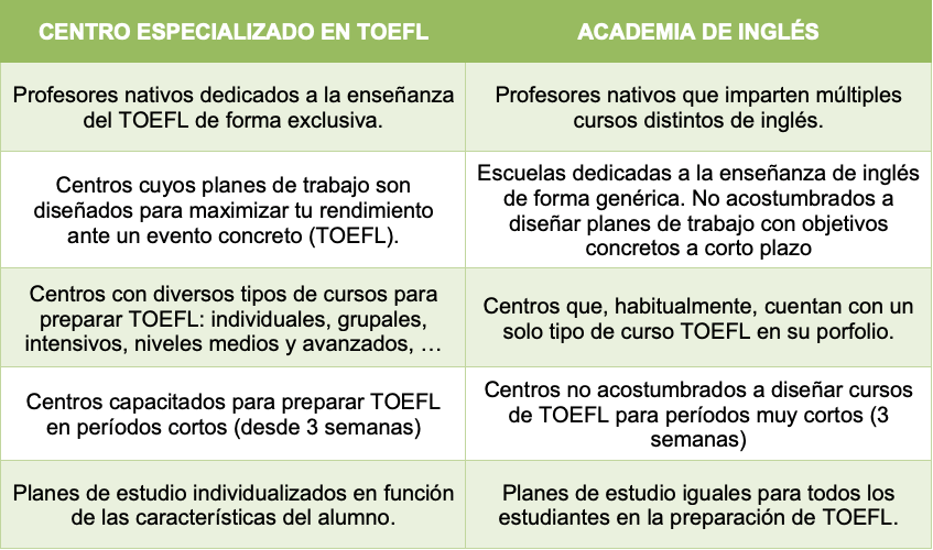 Como candidato te recomendamos que busques una preparación que se centre exclusivamente en maximizar tu nivel TOEFL en el menor tiempo posible. A continuación, te dejamos una serie de diferencias entre empresas especializadas en preparación de TOEFL y academias de inglés con cursos TOEFL.